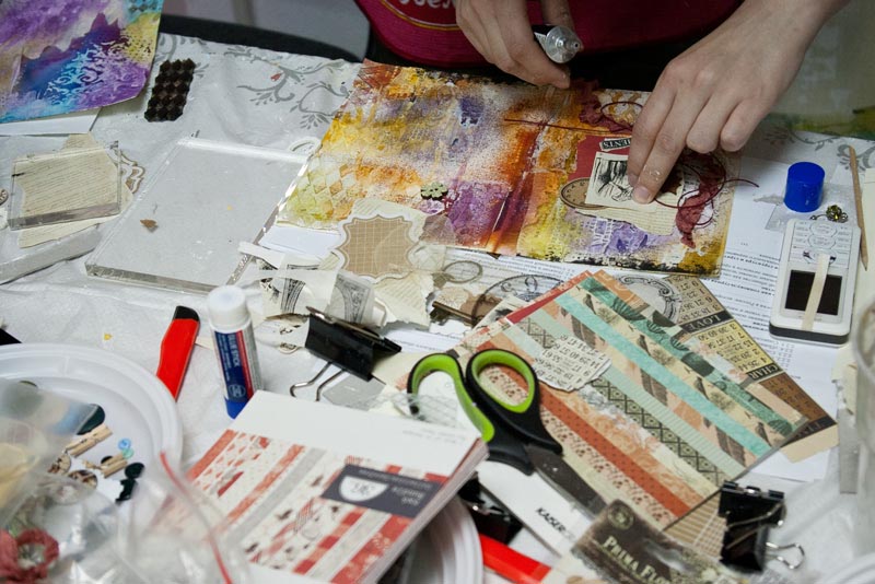 Следующий день (его легко отличить по Вике в красном платье), самый сложный МК - миниальбом "Алиса". На первом фото мы готовимся, все раскладываем.