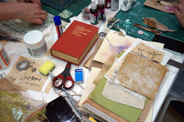 Рельеф на обложке сделан с помощью гладкой текстурной пасты, нанесенной через трафарет, покрыт грунтом и покрашен спреями. Я использовала много спреев: Танго, Фиалка, Мокко, Ночные огни, Крем-брюле, Гранат, Слива