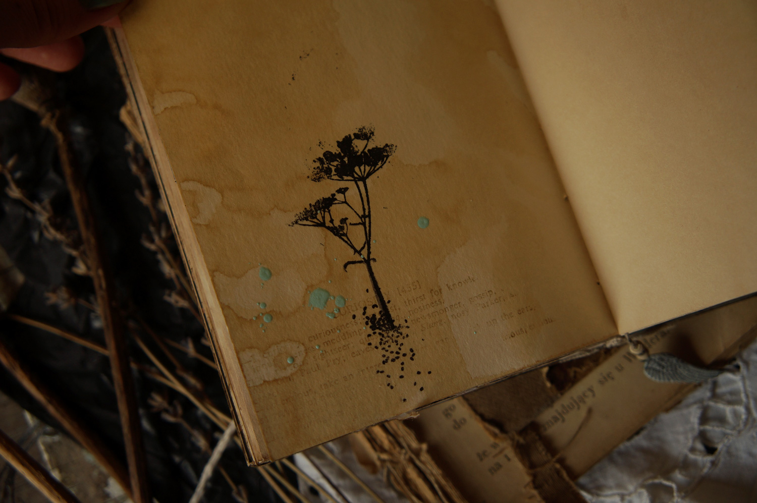В дело пошли рисунки акварелью и линером, фотографии различных фактур, сканы сухоцветов.